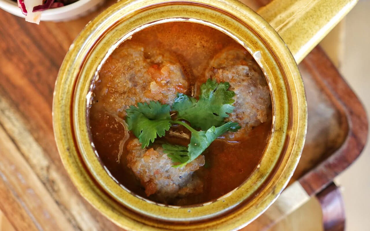 Pork meatballs in fresh tomato sauce, with baguette and side slaw.